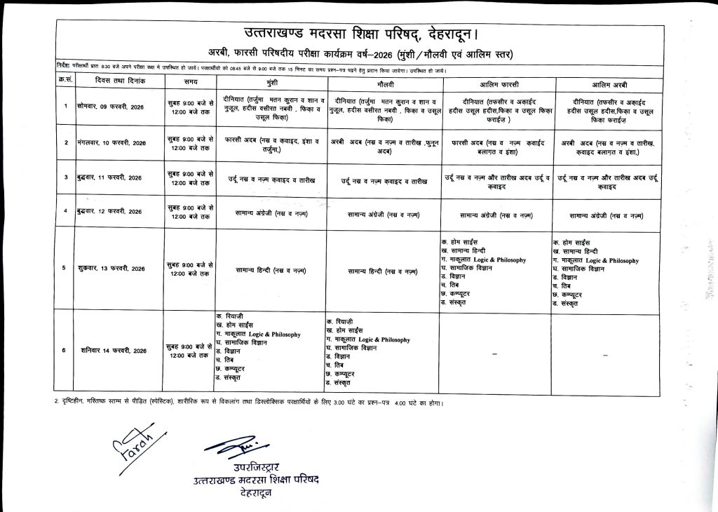 अरबी, फारसी परिषदीय परीक्षा कार्यक्रम वर्ष 2026 (मुंशी / मौलवी एवं आलिम स्तर)
